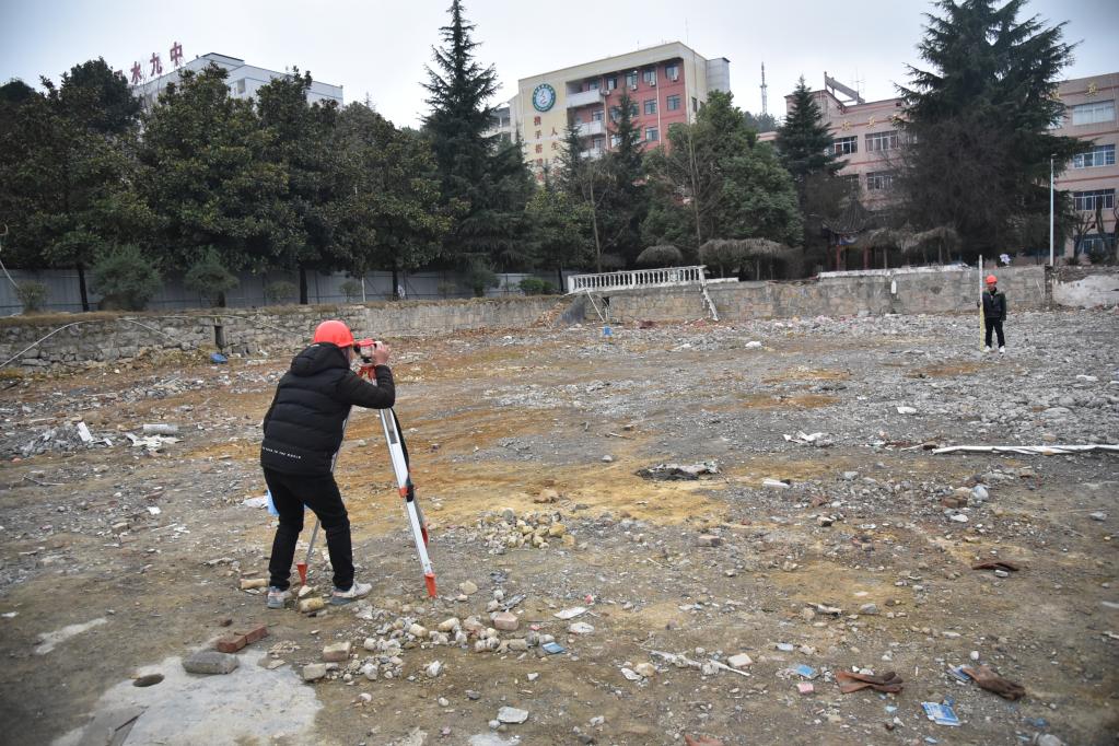 走進(jìn)位于貴州省遵義市習(xí)水縣老城區(qū)的習(xí)水縣第九中學(xué),施工場(chǎng)地上,工作人員正在勘測(cè)。眼前拆除的是學(xué)校一棟“服役”超過30年的3層教學(xué)樓。