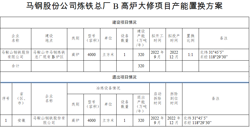 經(jīng)查閱資料并現(xiàn)場(chǎng)實(shí)地核查,該兩座高爐分別于2021年12月、2022年12月完成大修。大修后,兩座高爐的基礎(chǔ)和爐體框架尺寸不變,根據(jù)爐體砌筑圖核算爐容為4000立方米級(jí);高爐上料系統(tǒng)、鼓風(fēng)站風(fēng)機(jī)、熱風(fēng)爐為原設(shè)備利舊。評(píng)估結(jié)論認(rèn)為,馬鋼公司A、B高爐大修產(chǎn)能置換項(xiàng)目的設(shè)備數(shù)量、型號(hào)、規(guī)格與2021年7月22日公告的產(chǎn)能置換方案一致。