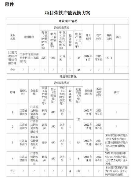 據(jù)江蘇省工業(yè)和信息化廳2月6日發(fā)布,按照《國務(wù)院關(guān)于化解產(chǎn)能嚴(yán)重過剩矛盾的指導(dǎo)意見》、《國務(wù)院關(guān)于鋼鐵行業(yè)化解過剩產(chǎn)能實(shí)現(xiàn)脫困發(fā)展的意見》和《鋼鐵行業(yè)產(chǎn)能置換實(shí)施辦法》要求,我廳自2022年12月27日至2023年1月29日對江陰興澄特種鋼鐵有限公司高爐項(xiàng)目產(chǎn)能置換方案進(jìn)行了公示,公示期間收到的異議已按程序進(jìn)行了處理。現(xiàn)予公告,歡迎社會公眾進(jìn)行監(jiān)督。