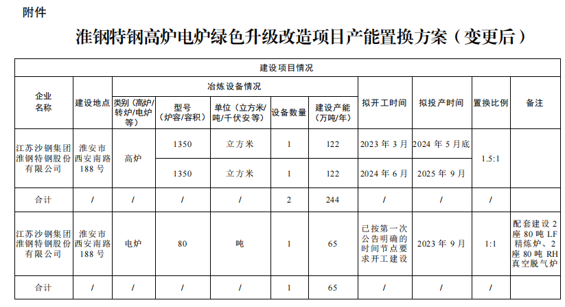 按照《國務(wù)院關(guān)于化解產(chǎn)能嚴(yán)重過剩矛盾的指導(dǎo)意見》、《國務(wù)院關(guān)于鋼鐵行業(yè)化解過剩產(chǎn)能實(shí)現(xiàn)脫困發(fā)展的意見》和《鋼鐵行業(yè)產(chǎn)能置換實(shí)施辦法》要求,我廳自2023年1月31日至2023年2月27日對江蘇沙鋼集團(tuán)淮鋼特鋼股份有限公司(以下簡稱淮鋼特鋼)高爐電爐綠色升級改造項(xiàng)目產(chǎn)能置換方案(變更后)進(jìn)行了公示,公示期間未收到異議?,F(xiàn)予公告,歡迎社會公眾進(jìn)行監(jiān)督。