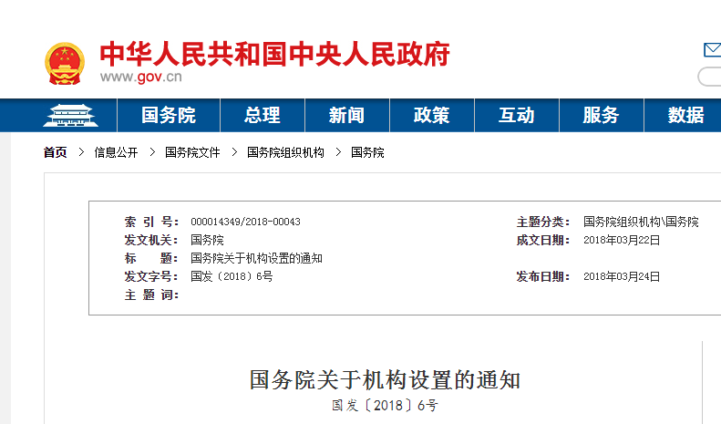 根據(jù)黨的十九屆三中全會(huì)審議通過(guò)的《深化黨和國(guó)家機(jī)構(gòu)改革方案》、第十三屆全國(guó)人民代表大會(huì)第一次會(huì)議審議批準(zhǔn)的國(guó)務(wù)院機(jī)構(gòu)改革方案和國(guó)務(wù)院第一次常務(wù)會(huì)議審議通過(guò)的國(guó)務(wù)院直屬特設(shè)機(jī)構(gòu)、直屬機(jī)構(gòu)、辦事機(jī)構(gòu)、直屬事業(yè)單位設(shè)置方案,現(xiàn)將國(guó)務(wù)院機(jī)構(gòu)設(shè)置通知如下:
