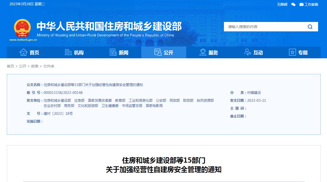 全國自建房安全專項整治工作開展以來,各地認真貫徹落實習近平總書記重要指示精神和黨中央、國務院決策部署,組織開展“百日行動”,對危及公共安全的經(jīng)營性自建房快查快改、立查立改,及時消除安全風險,取得積極成效。但經(jīng)營性自建房量大面廣、情況復雜,安全管理基礎(chǔ)薄弱,仍存在規(guī)劃建設(shè)管控不到位、審批與監(jiān)管脫節(jié)、經(jīng)營準入監(jiān)管缺失、管理機制不健全、監(jiān)管力量不足等問題。為全面加強經(jīng)營性自建房安全管理,推動建立經(jīng)營性自建房安全管理長效機制,切實維護人民群眾生命安全,經(jīng)國務院同意,現(xiàn)將有關(guān)事項通知如下。