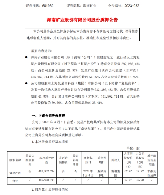 海南礦業(yè)表示,復(fù)星產(chǎn)投本次質(zhì)押股數(shù)為405,962,714股,占其所持股份比例67.97%,占公司總股本比例19.92%,為非融資性質(zhì)押。