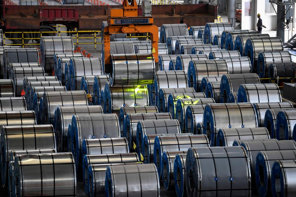 4月19日,在河北雙灤一家釩鈦新材料企業(yè)冷軋產(chǎn)品車間,工人在吊裝冷軋鍍鋅板。新華社發(fā)(王立群 攝)