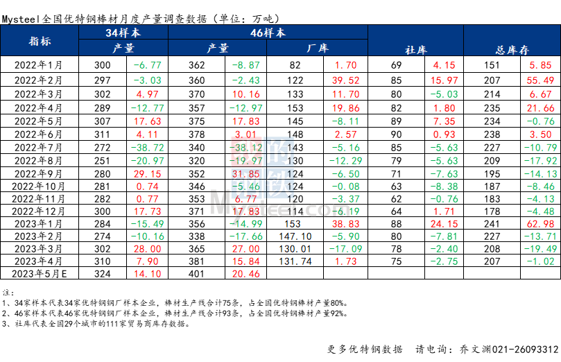 4月全國優(yōu)特鋼棒材(34家樣本)產(chǎn)量309.9萬噸,環(huán)比增加7.8萬噸,同比增加20.7萬噸;5月預計產(chǎn)量324萬噸,環(huán)比增加14.1萬噸,同比增加17.17萬噸;