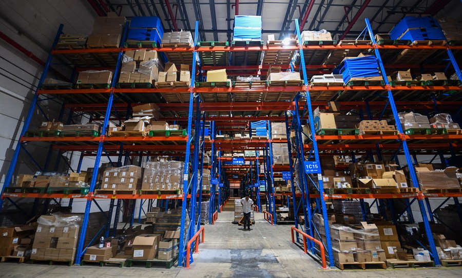 2022年9月2日,在杭州綜合保稅區(qū)一家跨境保稅倉內(nèi),工作人員在搬運(yùn)跨境電商保稅進(jìn)口商品。新華社記者 徐昱 攝