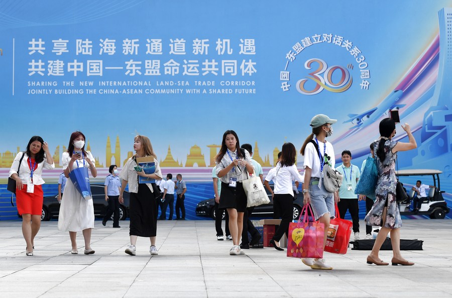 2021年9月11日,在廣西南寧國際會(huì)展中心,參觀者走出第18屆中國—東盟博覽會(huì)展館。新華社記者 陸波岸 攝