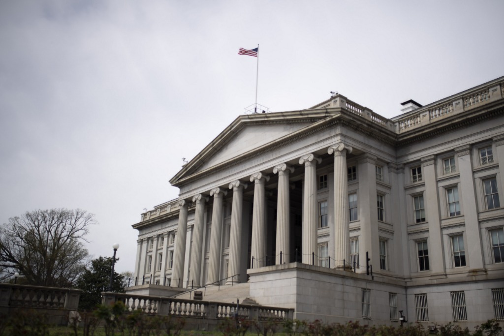 這是2020年3月27日在美國首都華盛頓拍攝的美國財政部大樓。新華社記者劉杰攝