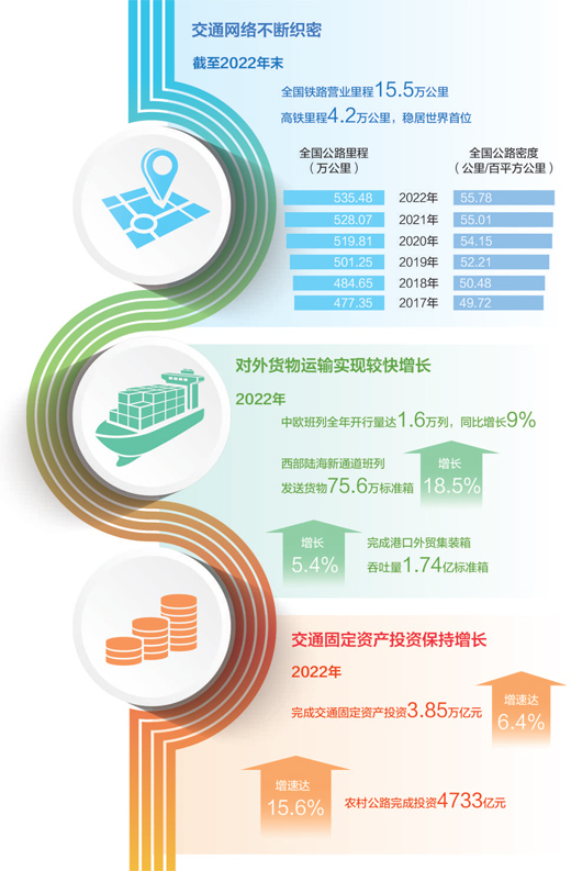 快速交通網(wǎng)加快延伸。2022年,全國新增高鐵里程2082公里、高速公路里程8181公里,年末里程分別達(dá)到4.2萬公里和17.7萬公里,均穩(wěn)居世界首位,其中全國高鐵營業(yè)里程占比提高至27%以上。