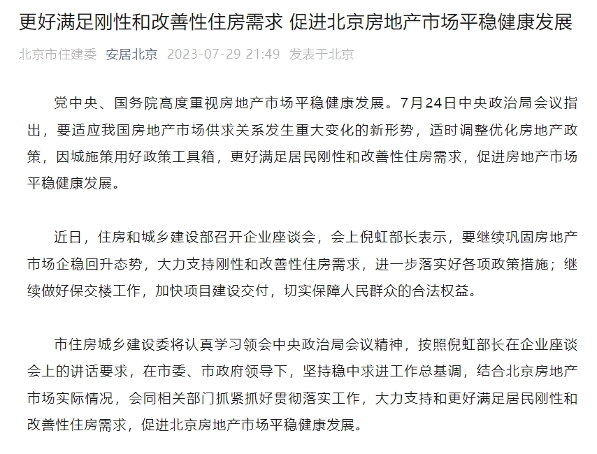 7月29日晚,北京市住建委官方公眾號(hào)“安居北京”發(fā)布消息稱,北京將更好滿足剛性和改善性住房需求,促進(jìn)北京房地產(chǎn)市場(chǎng)平穩(wěn)健康發(fā)展。