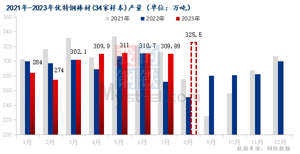7月全國優(yōu)特鋼棒材(34家樣本)產(chǎn)量309.9萬噸,環(huán)比減少0.8萬噸,同比增加37.7萬噸;8月預(yù)計(jì)產(chǎn)量325.5萬噸,環(huán)比增加15.6萬噸,同比增加74.3萬噸;