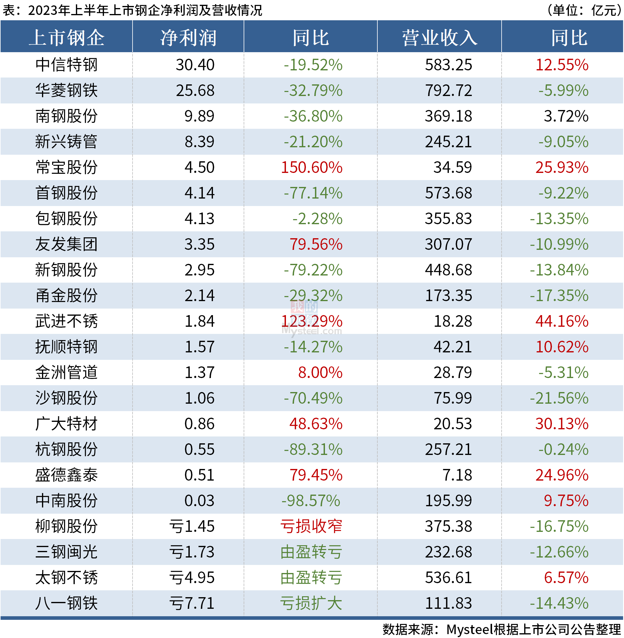 據(jù)Mysteel不完全統(tǒng)計,截至8月28日,已有22家上市鋼企公布2023年上半年業(yè)績報告,合計營業(yè)收入約786.24億元,合計凈利潤約87.52億元。