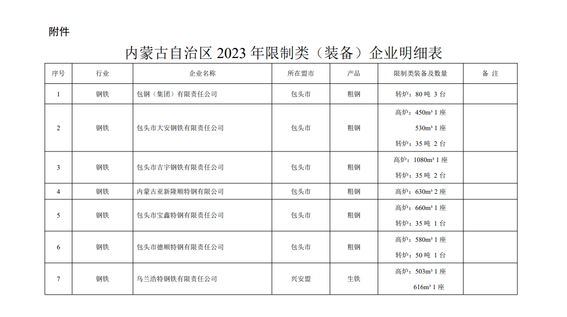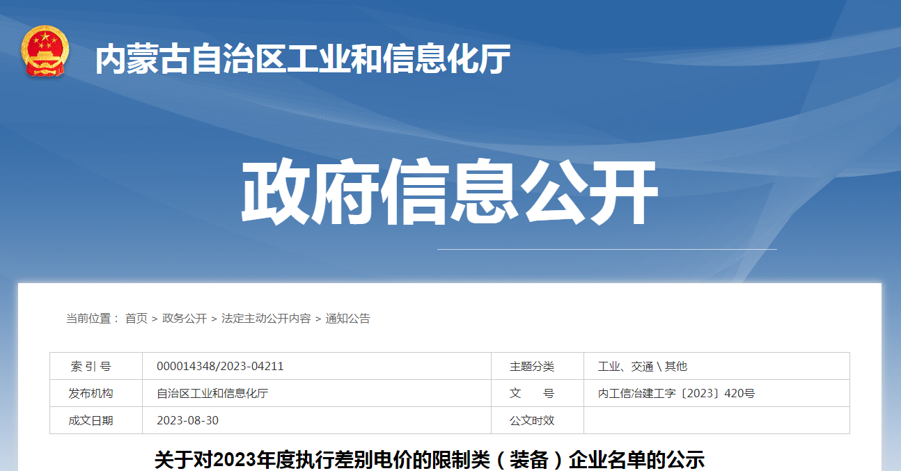 按照內(nèi)蒙古自治區(qū)發(fā)展改革委、工信廳《關(guān)于調(diào)整部分行業(yè)電價政策和電力行業(yè)市場交易政策的通知》(內(nèi)發(fā)改價費字〔2021〕115號》)、《關(guān)于進一步明確差別電價、階梯電價執(zhí)行時間的通知》(內(nèi)發(fā)改價費字〔2022〕2019號)等有關(guān)要求,各盟市對照《產(chǎn)業(yè)結(jié)構(gòu)調(diào)整指導目錄(2019本)》摸底排查鋼鐵、焦炭、鐵合金、電石等限制類(裝備)企業(yè),上報了2023年度限制類(裝備)企業(yè)執(zhí)行差別電價的名單?,F(xiàn)對名單予以公示,公示期自發(fā)布之日起5個工作日,請社會公眾進行監(jiān)督。公示期間,如有異議,請及時向自治區(qū)工業(yè)和信息化廳書面反映情況。