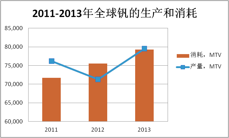 根據(jù)統(tǒng)計數(shù)據(jù)顯示,盡管2013年全球鋼鐵工業(yè)出現(xiàn)了疲軟態(tài)勢,但釩產(chǎn)量出現(xiàn)了反彈,從2011年的76,166噸金屬釩,2012的71,289噸反彈至79,534噸。