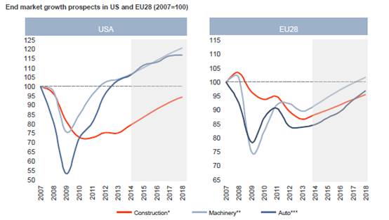 歐洲方面,在歐債危機和歐元區(qū)經(jīng)濟下行的負面影響下,2013年歐洲的粗鋼產(chǎn)量同比下跌1.8%,然而隨著危機逐漸退去,歐洲制造業(yè)PMI連續(xù)十個月保持在擴張區(qū)間,經(jīng)濟復(fù)蘇跡象明顯,同時,一季度歐元區(qū)的汽車注冊量同比上升8.6%,也顯示歐洲扁平材需求的回升是大概率事件。此外,2014年四季度,歐洲的粗鋼產(chǎn)量出現(xiàn)了兩年來的首次正增長,據(jù)FinancialTimes對15位鋼鐵行業(yè)分析師的調(diào)查顯示,2014年歐洲鋼鐵產(chǎn)量預(yù)計將同比上漲2.4%,市場信心明顯加強,反彈跡象日趨明朗,而據(jù)中國海關(guān)最新數(shù)據(jù)顯示,前四個月我國對歐美的鋼材出口量快速增長,也從另一個側(cè)面驗證了歐美的強勁復(fù)蘇。圖2為安賽樂米塔爾對歐美的下游用鋼行業(yè)的預(yù)測,建筑業(yè)、機械制造和汽車業(yè)的回暖態(tài)勢預(yù)計在未來五年內(nèi)將維持復(fù)蘇格局(如圖2)。