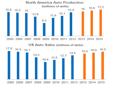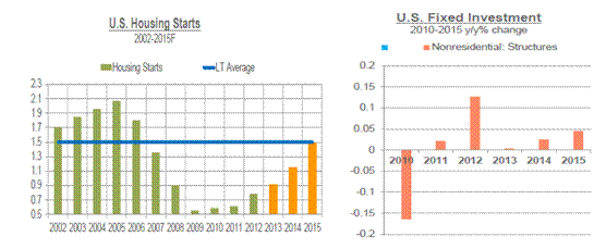 美國方面,2013年全國粗鋼產(chǎn)量為8700萬噸,同比下跌2%,隨著美國經(jīng)濟的進一步回暖和制造業(yè)的強勁復(fù)蘇,2014年美國的鋼鐵產(chǎn)量或?qū)㈦S需求的回暖而回升。如圖3所示,美國國內(nèi)汽車生產(chǎn)持續(xù)復(fù)蘇,據(jù)芝加哥聯(lián)邦儲備銀行預(yù)測,2014年美國汽車銷量將達1600萬輛,生產(chǎn)將達到1660萬輛。建筑業(yè)作為另一個重要的鋼鐵下游行業(yè),也將逐步回暖,據(jù)芝加哥聯(lián)邦儲備銀行統(tǒng)計,美國房屋新開工量自2010年開始逐步復(fù)蘇,到2015年美國房屋新開工量將恢復(fù)至十年來的平均水平,固定資產(chǎn)投資也將穩(wěn)步回升。2014年美國鋼鐵市場或?qū)⒕S持良好態(tài)勢。