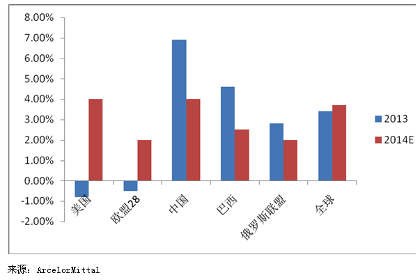 2013年歐美地區(qū)鋼材需求呈現(xiàn)負增長,據(jù)世界第一大鋼鐵生產(chǎn)企業(yè)安賽樂米塔爾的一份內(nèi)部報告顯示,2013年美國粗鋼表觀消費量同比下滑0.8%,歐洲下滑0.5%(如圖1所示),導(dǎo)致全年鋼鐵業(yè)困境重重。而2014年隨著歐美經(jīng)濟復(fù)蘇預(yù)期的加強,鋼鐵需求將會出現(xiàn)反彈,安米預(yù)計美國的粗鋼表觀消費量將在去年的基礎(chǔ)上增長3.5%-4.5%,歐洲的粗鋼表消費量則將回升1.5%-2.5%,需求回暖預(yù)期下,2014年歐美鋼鐵業(yè)料將漸入佳境。