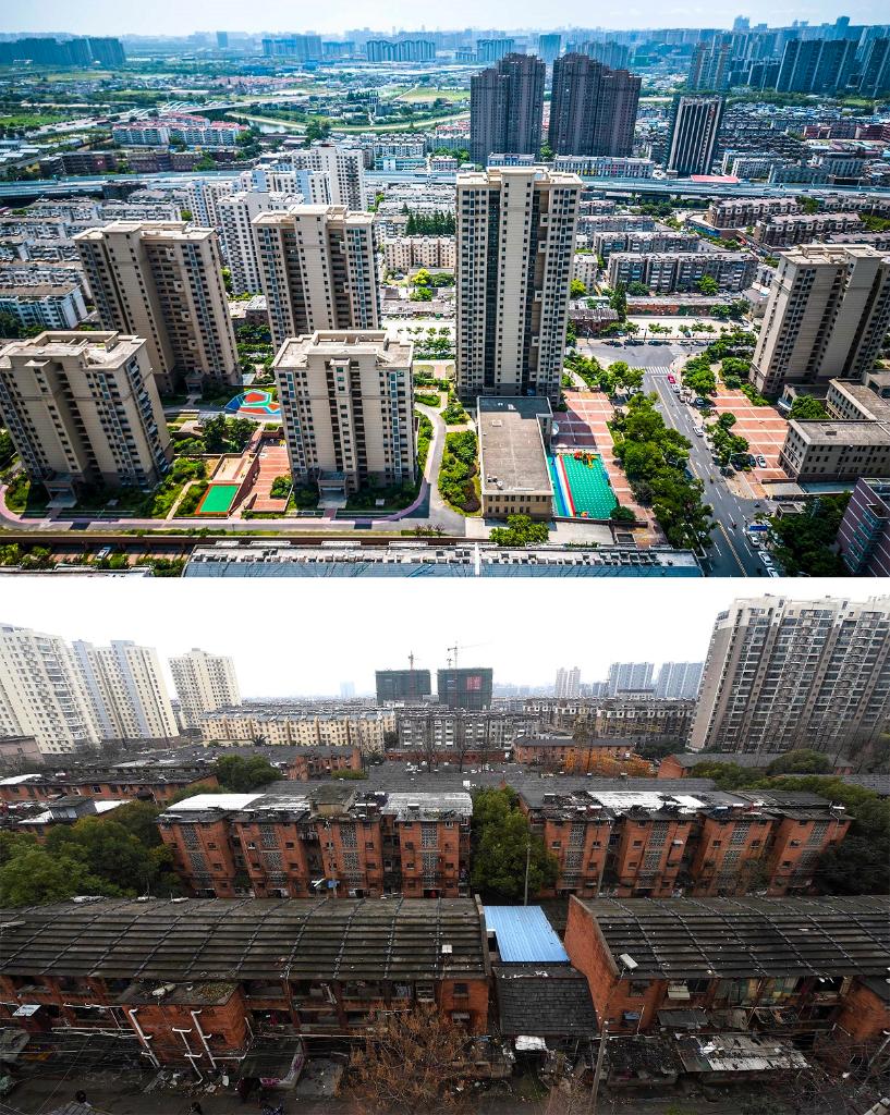 拼版照片:上圖為2023年8月3日拍攝的改造后的安徽省合肥市瑤海區(qū)安拖東村及新莊城中村改造項目(無人機照片);下圖為2015年3月拍攝的改造前的安拖東村及新莊城中村舊貌。 新華社發(fā)(解琛 攝)