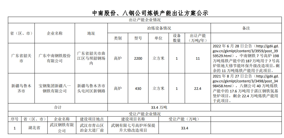 按照《國務(wù)院關(guān)于化解產(chǎn)能嚴(yán)重過剩矛盾的指導(dǎo)意見》、《國務(wù)院關(guān)于鋼鐵行業(yè)化解過剩產(chǎn)能實現(xiàn)脫困發(fā)展的意見》和《鋼鐵行業(yè)產(chǎn)能置換實施辦法》要求,經(jīng)國務(wù)院國資委(國資廳改革〔2021〕142號)和(國資廳改革〔2021〕283號)復(fù)函同意,擬將中南股份(原韶鋼松山)2200m3高爐和八鋼公司430m3高爐設(shè)備產(chǎn)能出讓?,F(xiàn)將中南股份2200m³高爐和八鋼公司430m³ 高爐對應(yīng)的33.4萬噸煉鐵產(chǎn)能出讓方案予以公示,公示期為2023年10月19日-11月15日,歡迎社會公眾進行監(jiān)督。