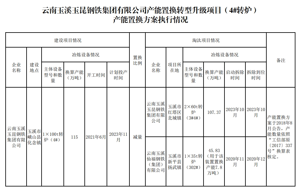 附件:云南玉溪玉昆鋼鐵集團(tuán)有限公司產(chǎn)能置換轉(zhuǎn)型升級項目(4#轉(zhuǎn)爐)產(chǎn)能置換方案執(zhí)行情況