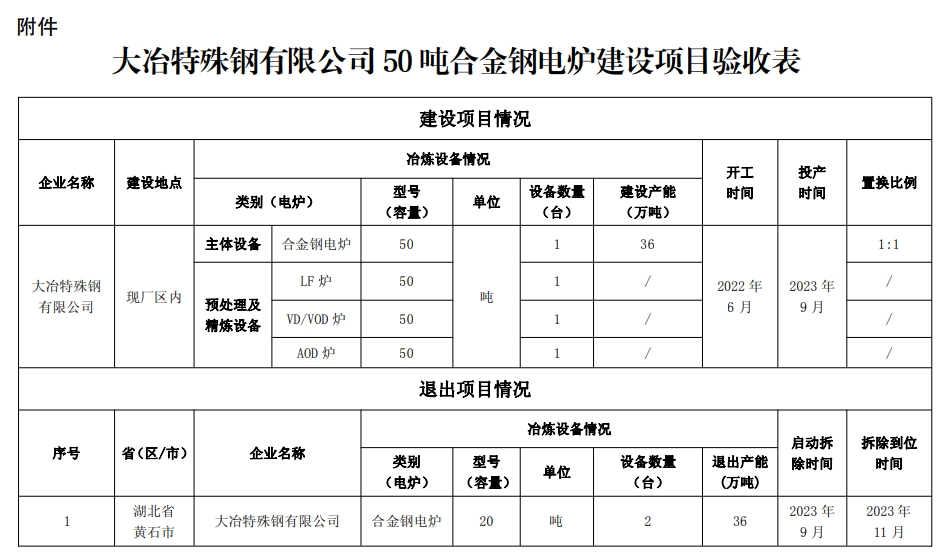 大冶特殊鋼有限公司依據(jù)省經(jīng)信廳〔2021〕年第8號公告的50噸合金鋼電爐產(chǎn)能置換項目已建成。用于置換的2臺20噸電爐已按規(guī)定完成拆除,通過省級驗收;新建項目經(jīng)第三方機構(冶金工程咨詢甲級資質(zhì))評估公稱容量為50噸,與公告方案一致。