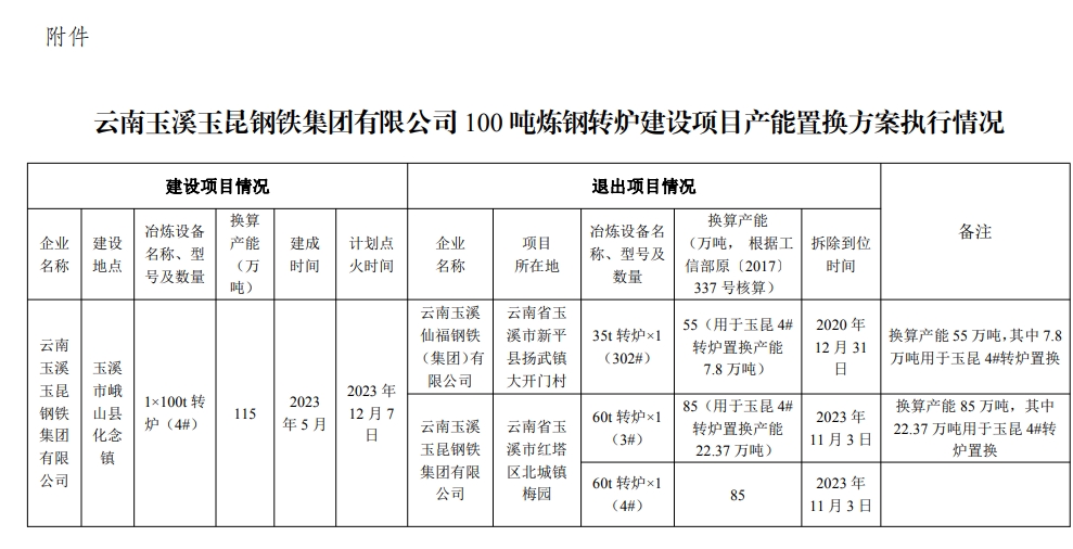 附件:云南玉溪玉昆鋼鐵集團(tuán)有限公司100噸煉鋼轉(zhuǎn)爐建設(shè)項(xiàng)目產(chǎn)能置換方案執(zhí)行情況