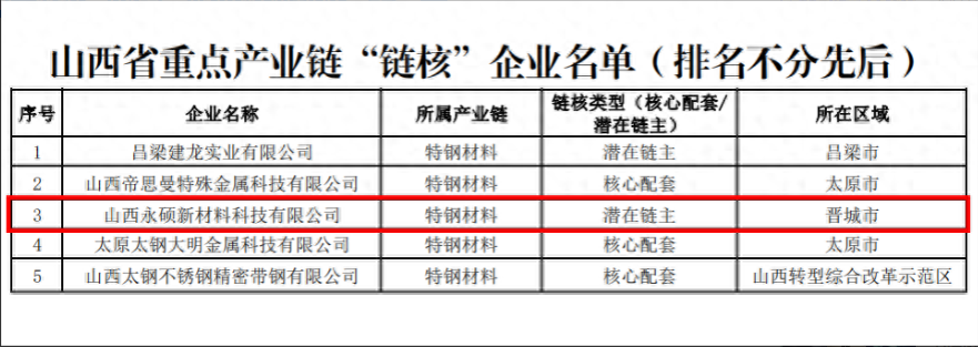 近日,山西省重點產(chǎn)業(yè)鏈鏈長制領導小組辦公室公布山西省重點產(chǎn)業(yè)鏈“鏈核”企業(yè)名單。晉鋼控股集團永碩新材料科技有限公司按照《山西省重點產(chǎn)業(yè)鏈“鏈主”企業(yè)遴選及管理辦法》“鏈核”企業(yè)遴選程序,經(jīng)各鏈長牽頭單位組織遴選,企業(yè)自主申報、市級審核推薦、專家會議評審、鏈長審定、社會公示等遴選程序,最終被確定為山西省重點產(chǎn)業(yè)鏈“鏈核”企業(yè)。此項榮譽的獲得充分展示了集團永碩新材料科技有限公司在特鋼材料產(chǎn)業(yè)鏈中的重要地位和強勁發(fā)展勢頭。