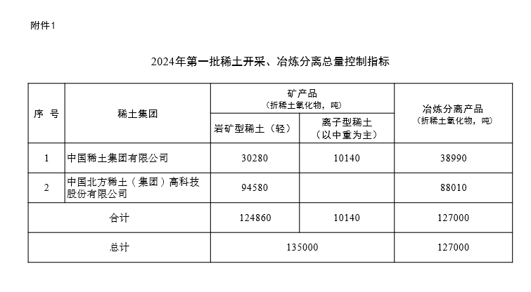 一、2024年第一批稀土開采、冶煉分離總量控制指標(biāo)分別為135000噸、127000噸(兩家稀土集團的分解情況見附件1)。