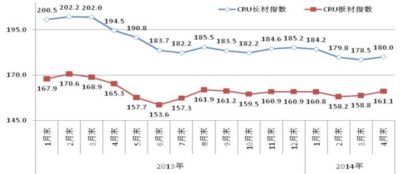 CRU國際長材和板材價(jià)格指數(shù)走勢圖