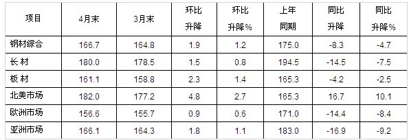 4月末,CRU國際鋼材綜合價(jià)格指數(shù)為166.7點(diǎn),環(huán)比上升1.9點(diǎn),升幅為1.2%,是連續(xù)三個(gè)月下降后的首次回升;與上年同期相比下降8.3點(diǎn),降幅為4.7%。(見下圖、下表)