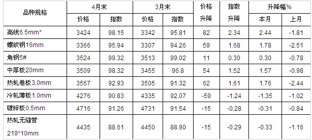主要鋼材品種價(jià)格及指數(shù)變化情況表(單位:元/噸)
