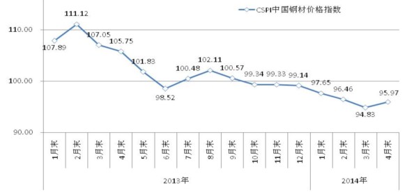 4月末,鋼鐵協(xié)會(huì)CSPI鋼材綜合價(jià)格指數(shù)為95.97點(diǎn),環(huán)比上升1.14點(diǎn),升幅為1.20%,是連續(xù)7個(gè)月下跌后的首次回升;比上年同期下降9.78點(diǎn),降幅為9.25%。(見(jiàn)下圖)