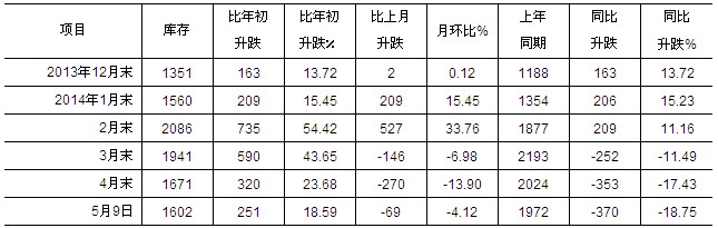 截止5月9日,全國(guó)主要市場(chǎng)五種主要鋼材社會(huì)庫(kù)存量降至1602萬(wàn)噸,比4月末下降69萬(wàn)噸,環(huán)比降幅為4.12%;與上年同期相比,下降370萬(wàn)噸,降幅為18.75%。自今年2月末以來(lái),鋼材社會(huì)庫(kù)存已連續(xù)10周下降,5月9日庫(kù)存水平同2月末峰值相比,已累計(jì)下降了484萬(wàn)噸,降幅達(dá)23.20%。鋼材庫(kù)存持續(xù)回落,對(duì)后期鋼價(jià)走勢(shì)壓力有所減輕。(見(jiàn)下表)