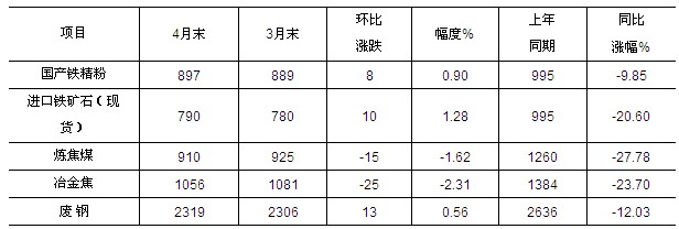 4月份,鋼鐵生產(chǎn)用原燃材料價(jià)格出現(xiàn)回漲走勢(shì)。其中:國(guó)產(chǎn)鐵精粉價(jià)格在連續(xù)下降3個(gè)月后,環(huán)比上升8元/噸,升幅為0.90%;進(jìn)口鐵礦石價(jià)格在連續(xù)第5個(gè)月下降后,環(huán)比上升10元/噸,升幅為1.28%;廢鋼價(jià)格在連續(xù)第7個(gè)月下降后,環(huán)比上升13元/噸,升幅為0.56%;煉焦煤、冶金焦價(jià)格雖繼續(xù)下降,但環(huán)比降幅分別較上月收窄6.80和7.00個(gè)百分點(diǎn)。原燃材料價(jià)格止跌回升,對(duì)鋼價(jià)有一定的支撐作用。(見(jiàn)下表)