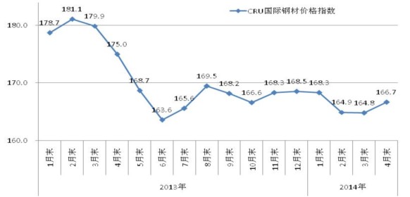 4月末,CRU國(guó)際鋼材綜合價(jià)格指數(shù)為166.7點(diǎn),環(huán)比上升1.9點(diǎn),升幅為1.2%,是連續(xù)三個(gè)月下降后的首次回升;與上年同期相比下降8.3點(diǎn),降幅為4.7%。(見(jiàn)下圖、下表)