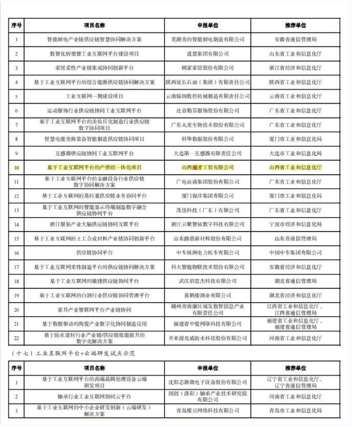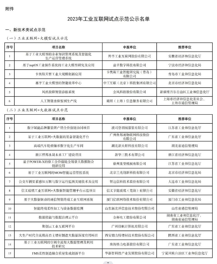 為深入貫徹《國(guó)務(wù)院關(guān)于深化“互聯(lián)網(wǎng)+先進(jìn)制造業(yè)”發(fā)展工業(yè)互聯(lián)網(wǎng)的指導(dǎo)意見(jiàn)》,根據(jù)《工業(yè)和信息化部辦公廳關(guān)于組織開(kāi)展2023年工業(yè)互聯(lián)網(wǎng)試點(diǎn)示范項(xiàng)目申報(bào)工作的通知》(工信廳信管函﹝2023﹞319號(hào)),經(jīng)企業(yè)申報(bào)、地方推薦、專(zhuān)家評(píng)審,形成2023年工業(yè)互聯(lián)網(wǎng)試點(diǎn)示范名單。