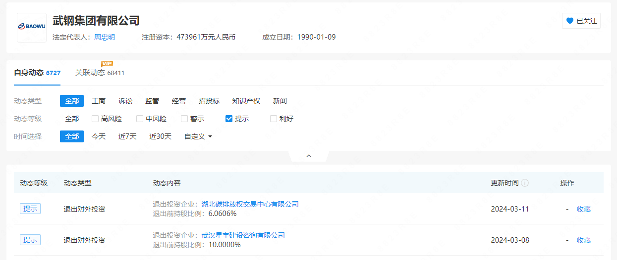近日,據(jù)企查查顯示,武鋼集團(tuán)有限公司連續(xù)退出兩家對(duì)外投資企業(yè),分別是湖北碳排放權(quán)交易中心有限公司和武漢星宇建設(shè)咨詢有限公司,具體情況如下:
