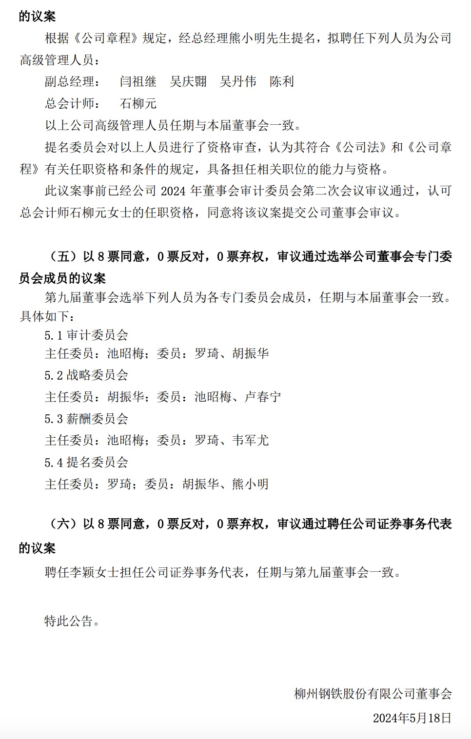 日前,柳鋼股份發(fā)布了《柳州鋼鐵股份有限公司第九屆董事會第一次會議決議公告》(以下簡稱《公告》)。