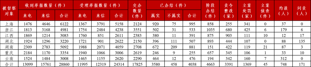 截至6月1日晚20:00,各督察組共收到群眾來電、來信舉報28860件,受理有效舉報24314件,經(jīng)梳理合并重復(fù)舉報,累計向有關(guān)?。ㄊ校┺D(zhuǎn)辦17825件。有關(guān)?。ㄊ校┮艳k結(jié)或階段辦結(jié)8701件。其中,立案處罰1369家,立案偵查45件;約談黨政領(lǐng)導(dǎo)干部748人,問責(zé)黨政領(lǐng)導(dǎo)干部171人。