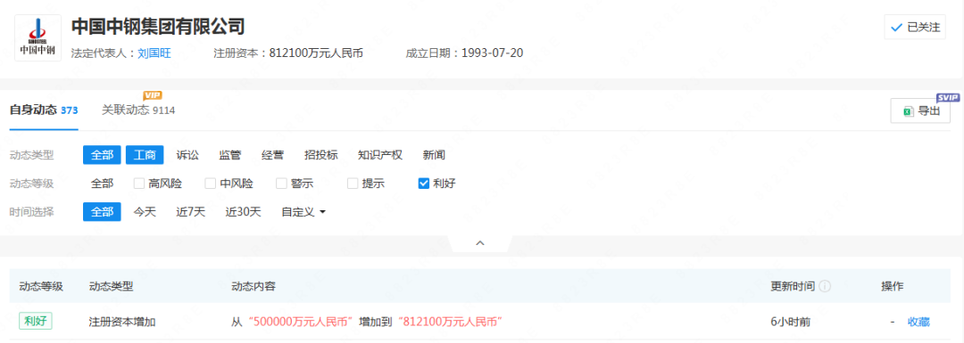 近日,據(jù)企查查顯示,中國中鋼集團有限公司注冊資本增加,從“500000萬元人民幣”增加到“812100萬元人民幣”,增加了312100萬元,增資比例超62%,具體情況如下: