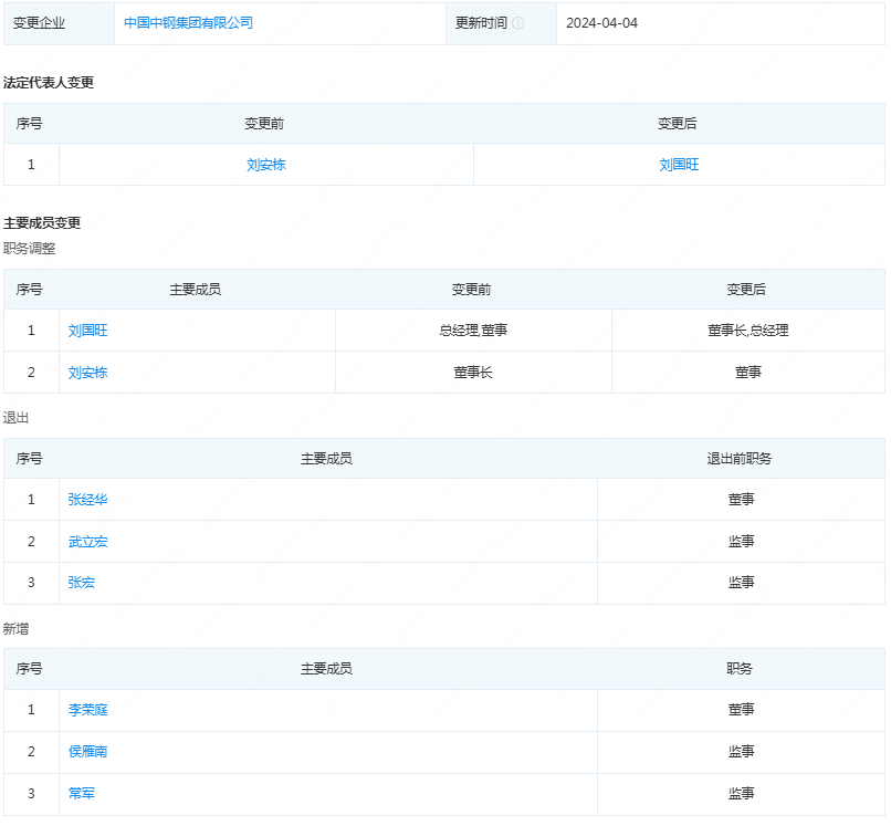 而在2024年4月4日,中鋼集團發(fā)生了人事大調(diào)整,法定代表人從劉安棟變更為劉國旺,主要成員也發(fā)生了相應(yīng)的變更,如下: