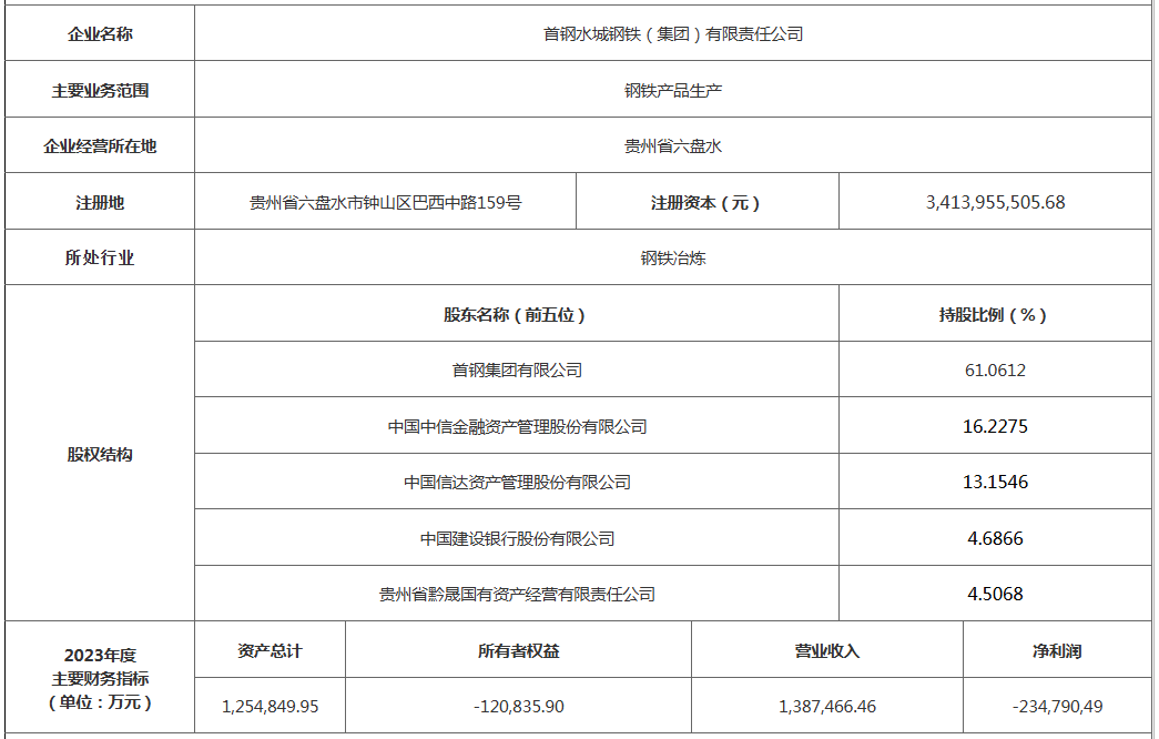 截至2023年12月31日,水鋼注冊(cè)資本34.14億元,資產(chǎn)總額125.48億元,負(fù)債137.57億元,歸屬于母公司所有者權(quán)益-19.81億元;2023年?duì)I業(yè)收入138.75億元,凈利潤(rùn)-23.62億元。