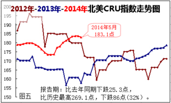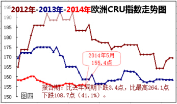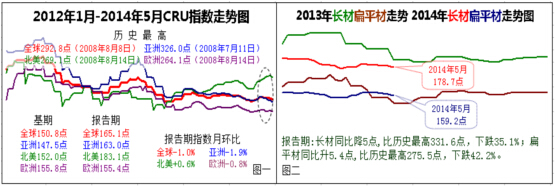 5月份的國際鋼市總體走勢較弱。月末,165.1點的CRU總指數(shù)月環(huán)比下跌1%(跌幅擴大)。其中:亞洲指數(shù)163點,月環(huán)比下跌1.9%(跌幅擴大);歐洲指數(shù)155.4點,月環(huán)比下跌0.8%,(跌幅擴大);北美指數(shù)183.1%,月環(huán)比上漲0.6%(漲幅收斂);扁平材指數(shù)159.2點,月環(huán)比下跌1.2%(跌幅擴大);長材指數(shù)178.7點,月環(huán)比下跌0.7%(跌幅擴大)。CRU運行態(tài)勢可見,經(jīng)過一段時間的漲跌互現(xiàn)格局后,到5月中旬,連走勢最強的美國鋼市也開始出現(xiàn)滯漲態(tài)勢。因此結(jié)合基本面情況預(yù)測,近期全球鋼市將呈震蕩趨弱走勢。(見下圖一、圖二)