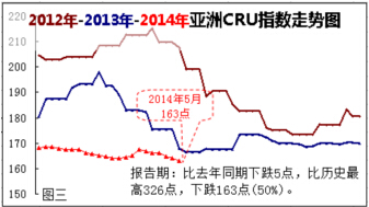 亞洲鋼材市場:繼續(xù)下跌。該地區(qū)163點的CRU指數(shù),月環(huán)比下跌1.9(跌幅擴大),年同比下跌7.1%(跌幅擴大)。(見下圖三)