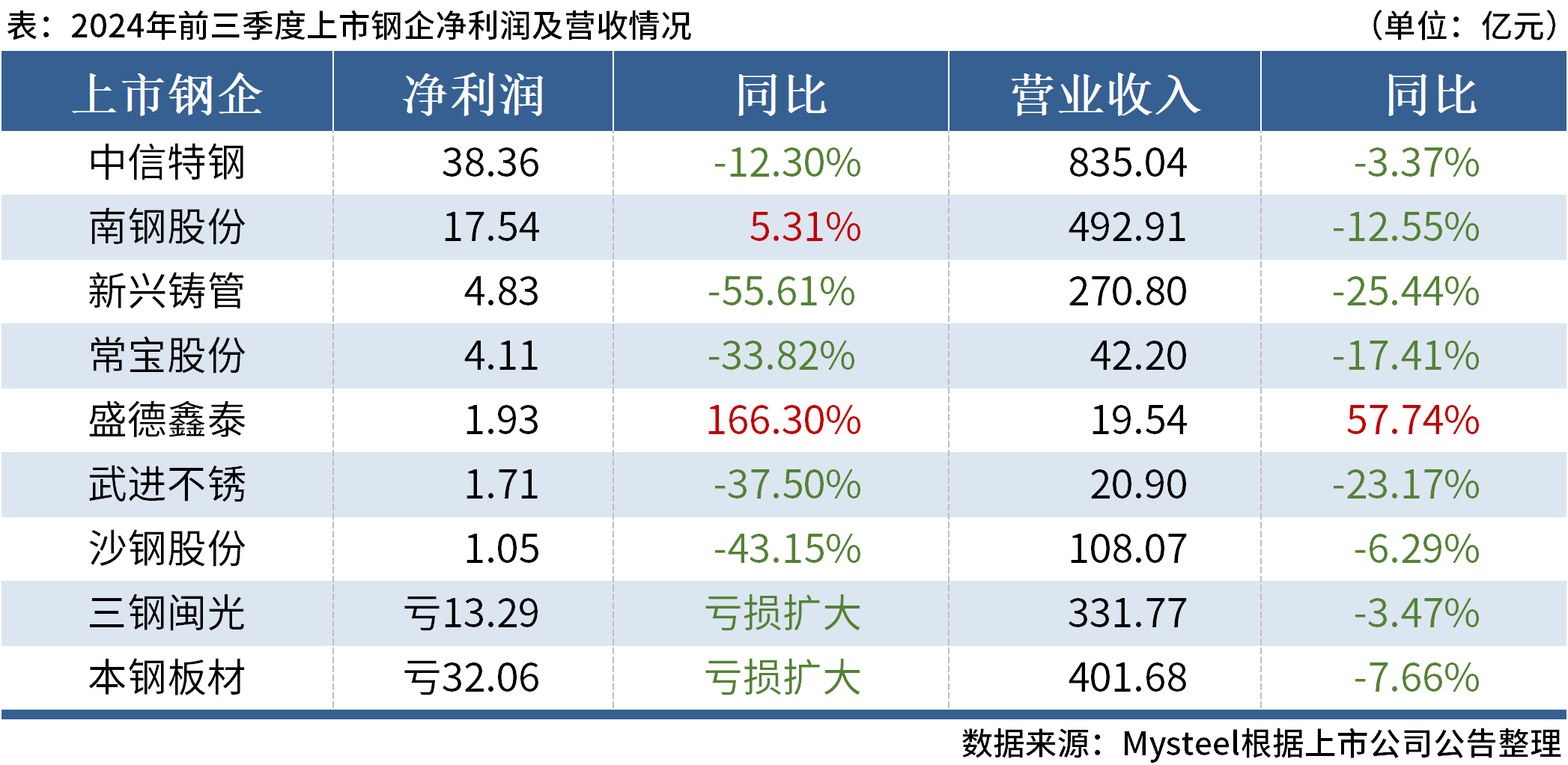 據(jù)Mysteel不完全統(tǒng)計(jì),截至10月29日,9家上市鋼企公布2024年前三季度業(yè)績(jī),合計(jì)營(yíng)業(yè)收入2522.91億元,合計(jì)凈利潤(rùn)24.18億元。