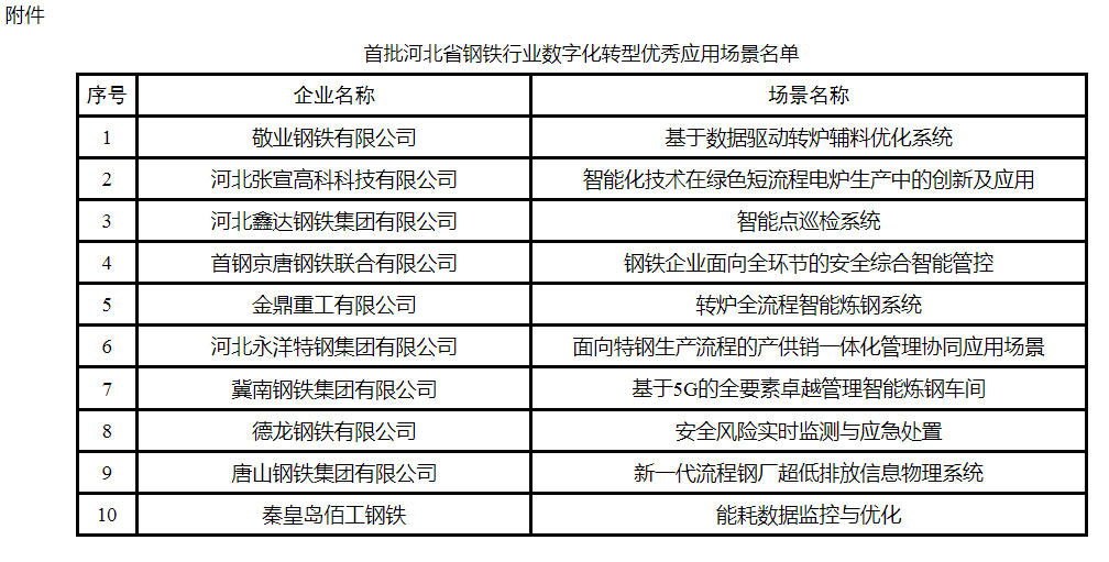 附件:首批河北省鋼鐵行業(yè)數(shù)字化轉(zhuǎn)型優(yōu)秀應(yīng)用場(chǎng)景名單