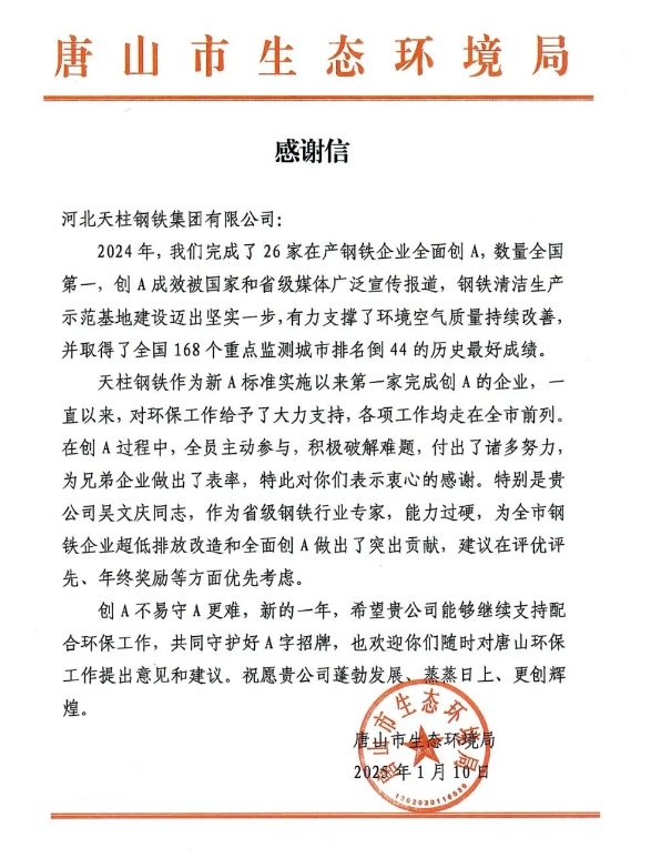 1月10日,天柱集團收到了來自唐山市生態(tài)環(huán)境局發(fā)來的感謝信,信中對公司深入推進環(huán)保創(chuàng)A工作給予表揚,對天柱集團為全市超低排放改造和全面創(chuàng)A做出的突出貢獻表示感謝。