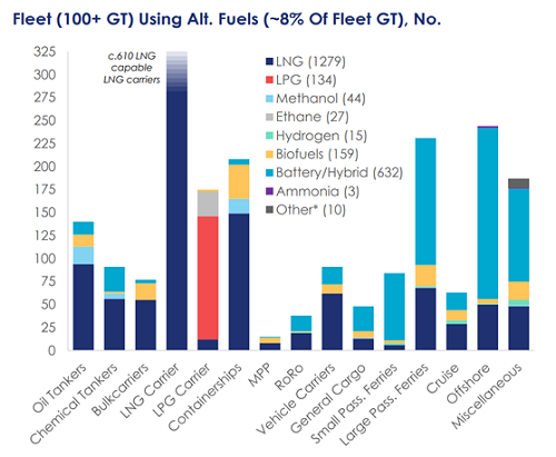 根據(jù)克拉克森的數(shù)據(jù),整體而言按噸位計(jì)算,截至目前在運(yùn)營船隊(duì)中能夠使用替代燃料或推進(jìn)裝置船舶的比例已經(jīng)提高到了7.6%,高于2017年的2.5%和2023年年初的5.3%。在現(xiàn)有總計(jì)2170艘替代燃料船舶中,包括1279艘LNG動力船、44艘甲醇動力船、134艘LPG動力船、632艘電池/混合動力推進(jìn)船,此外還有214艘采用其他燃料。
