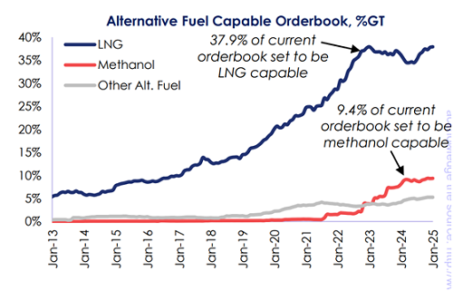 今年的替代燃料船舶訂單包括LNG動力船390艘4620萬總噸,甲醇動力船119艘890萬總噸,LPG動力船72艘30萬總噸,以及電池/混合動力推進(jìn)船舶206艘170萬總噸。