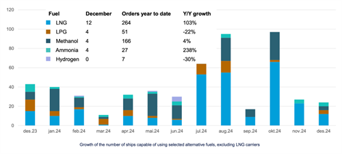 與此同時(shí),DNV的替代燃料洞察(AFI) 數(shù)據(jù)平臺最新統(tǒng)計(jì)指出,2024年全球替代燃料船舶訂單大幅增長至515艘,與2023年相比漲幅達(dá)38%。其中LNG燃料成為了2024年的行業(yè)首選,新船訂單數(shù)量多達(dá)264艘,是2023年130艘的兩倍以上。此外,甲醇燃料船訂單也增至4%達(dá)到166艘,占去年替代燃料船舶新船訂單的32%,這些訂單中的大多數(shù)都是集裝箱船(85艘);氨燃料船全年新船訂單總量增長238%至27艘,去年出現(xiàn)了首批非氣體運(yùn)輸船的氨燃料船舶訂單(10艘),主要為散貨船(5艘)。
